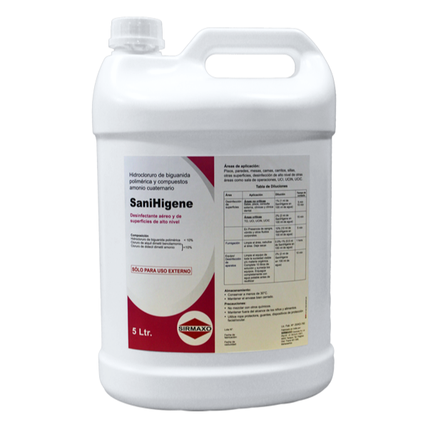 SaniHigene es un desinfectante aéreo y de supercicies de alto nivel libre de aldehído y de acción rápida, es bactericida (SARM), fungicida, virucida (VIH, VHB), micobactericida y pseudomonicida.