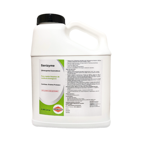 Sanizyme detergente y limpiador enzimático asegura una limpieza eficaz y de acción rápida en el reprocesamiento de instrumentos termoestables y termolábiles como instrumental quirúrgico, endoscopios rígidos y flexibles, laparoscopios, endoscopios e instrumental odontológico asegurando así la eliminación de residuos orgánicos.